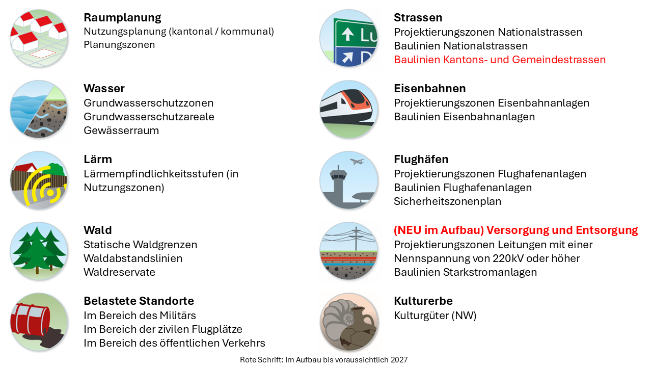 Hinweis: Zurzeit enthält der ÖREB-Kataster NW & OW noch keine Objekte dazu. Dieses Thema wird in der Weiterentwicklungsperiode 2020-2023 integriert.