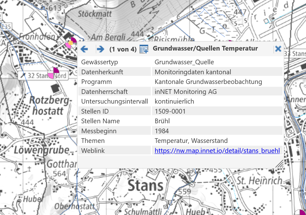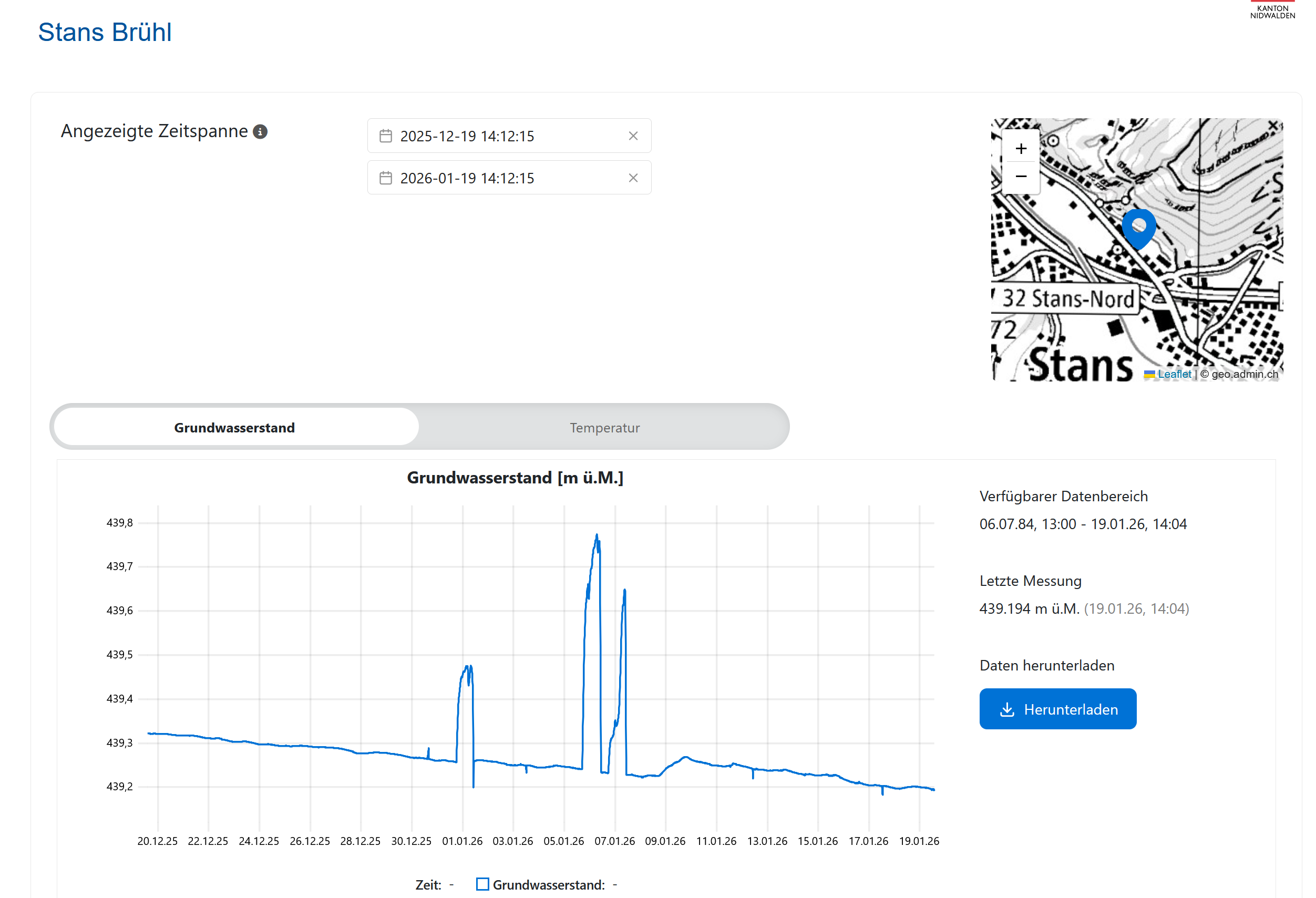 In den Webkarten Gewässerüberwachung und Grundwasserthemen des Kantons Nidwalden steht bei den Grundwassermessstellen neu ein Direktlink zu den aktuellen Messdaten zur Verfügung. Über diesen Link können sowohl aktuelle als auch historische Messwerte abgefragt werden. Verfügbar sind Daten zum Grundwasserstand und zur Grundwassertemperatur. Bei ausgewählten Messstellen werden zusätzlich auch Werte zur elektrischen Leitfähigkeit angezeigt.
